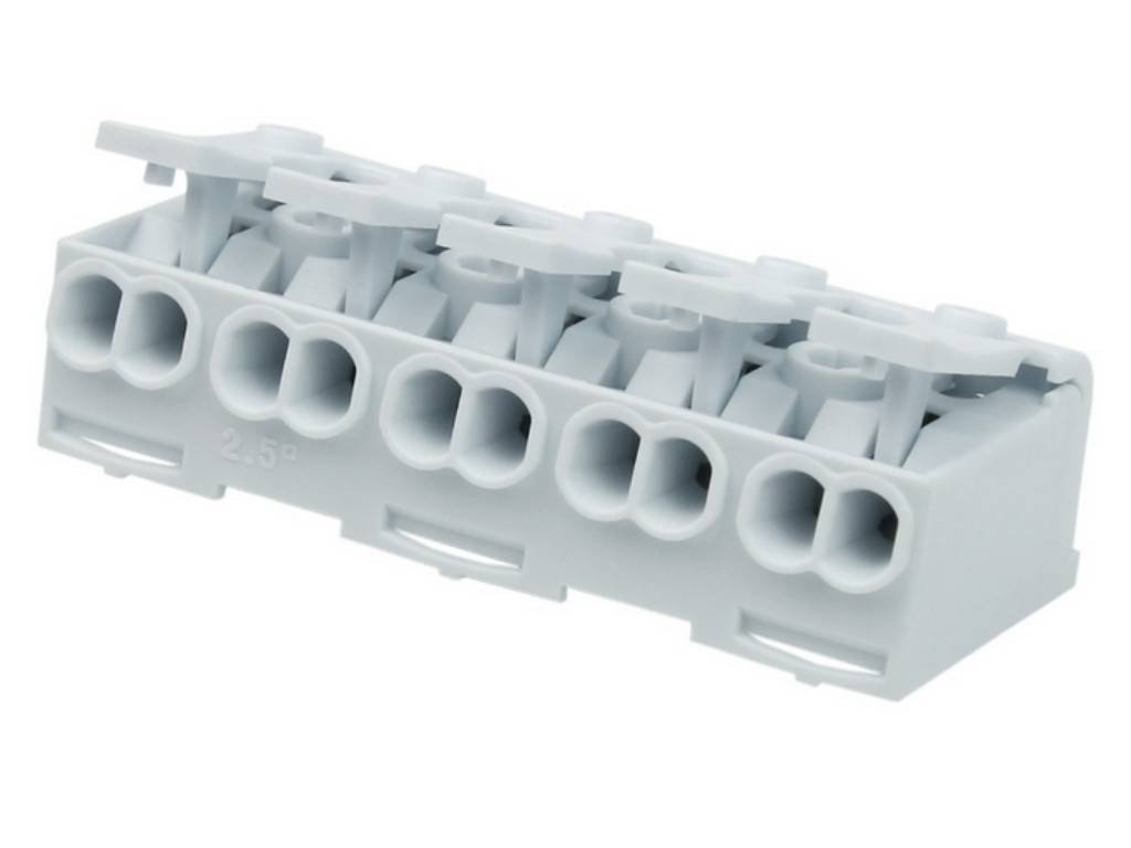 Pružinová svorkovnice je označovaná také jako "svítidlová svorka". Tento typ svorkovnice je vybaven 5 pružinovými svorkami, které umožňují připojení vodičů s maximálním průřezem až 2,5mm². Svorkovnice je určena pro použití při napětí až 450V s maximálním proudem 24A. Je ideální pro aplikace, kde je potřeba připojit více vodičů s menším průřezem. Bílá barva poskytuje jasný přehled a čistý vzhled.
