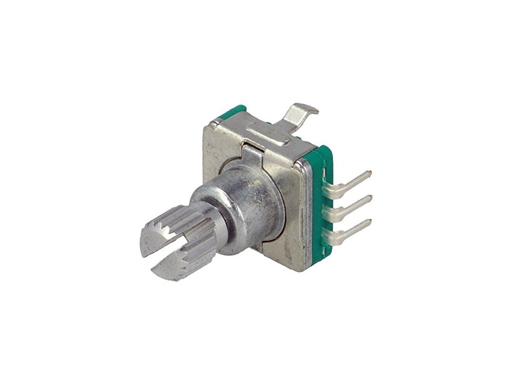 Enkodér; inkrementální; rozlišení 15 impulsů/otáčka; 15 poloh; max. pracovní napětí 5V; max. pracovní proud 5mA; dva výstupní signály + tlačítko; životnost až 30 000 cyklů; rýhovaná hřídel o průměru 6mm a délce 7mm; THT montáž do DPS.