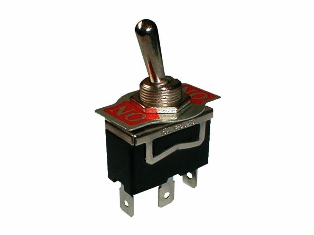 Páčkový přepínač; SPDT konfigurace; ON-ON; 2 stabilní polohy; zatížitelnost až 10A/250VAC; průměr montážního otvoru 12,2mm; černý; 3x fast-on konektory.