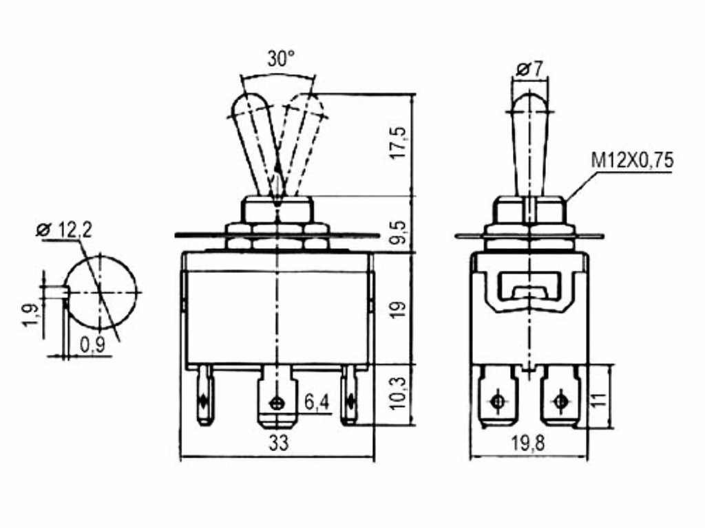 Páčkový přepínač; DPDT konfigurace; ON-ON; 2 stabilní polohy; zatížitelnost až 10A/250VAC; průměr montážního otvoru 12,2mm; černý; 6x fast-on konektory.