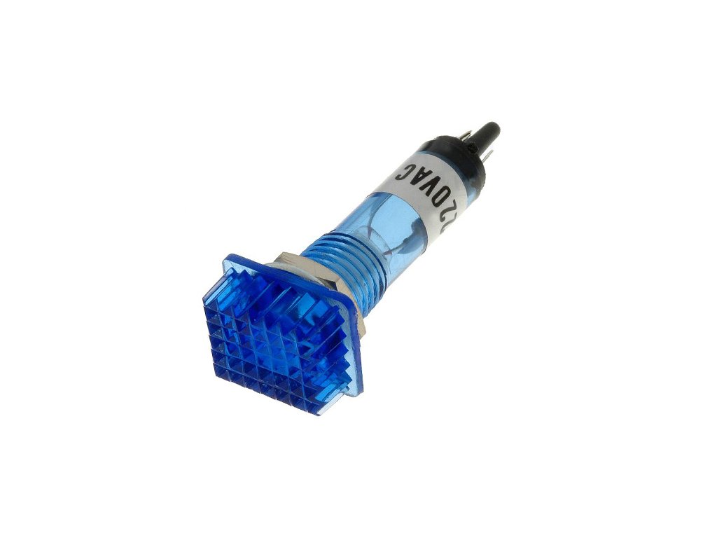 Kontrolka s doutnavkou; plochá čtvercová; modrá; 230VAC; průměr 10mm; vývody pájecí.
