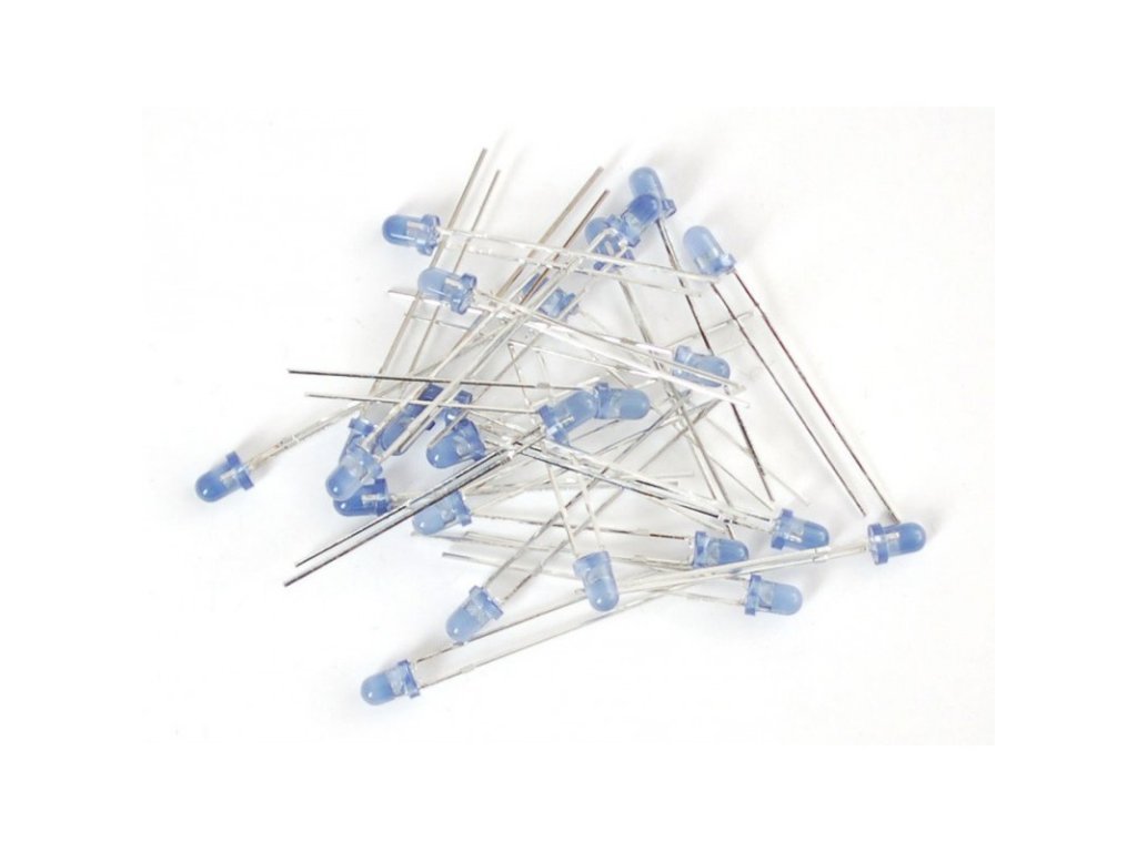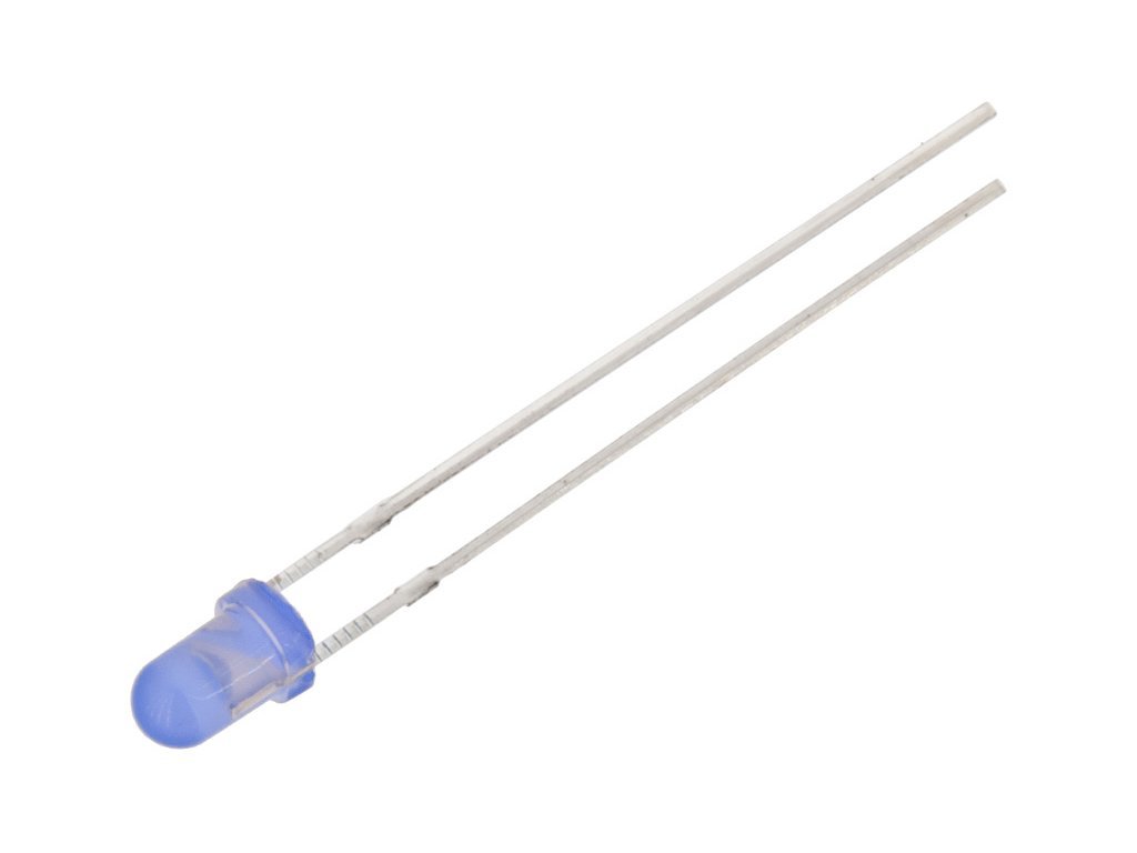 LED dioda; 3mm; modrá 465÷475 nm ; vyzařovací úhel 70°; pracovní bod 3,1V/20mA; difuzní čočka; vypouklé čelo; THT montáž do DPS.