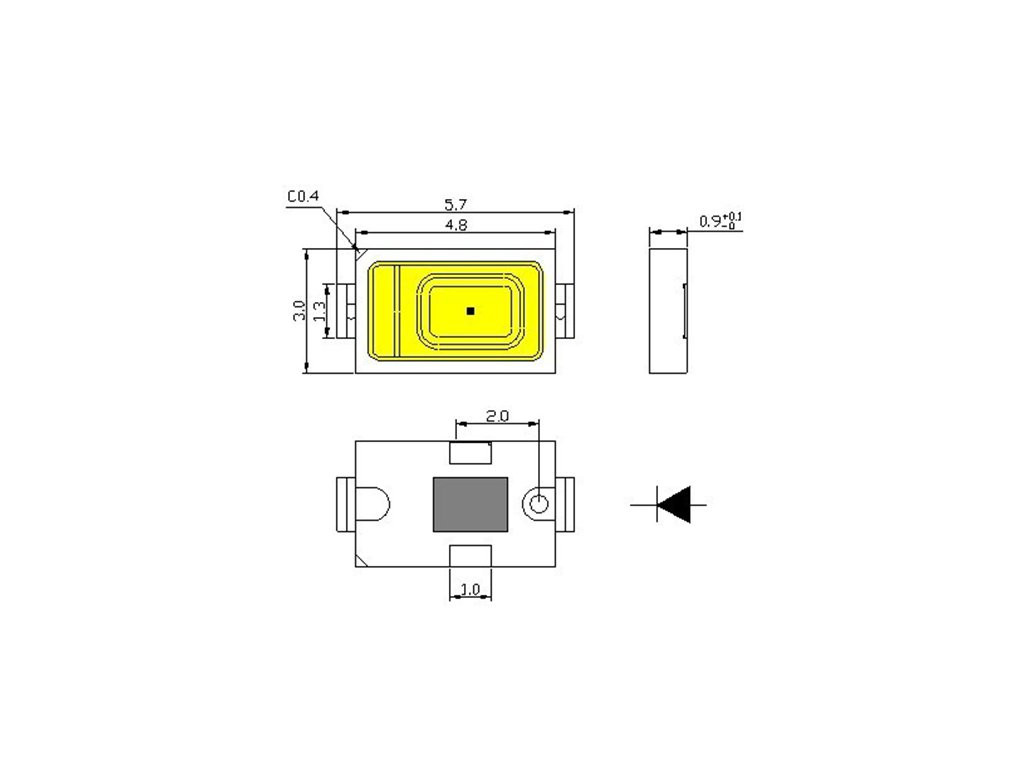 LED dioda SMD 5730; bílá studená; 4750÷5300K; svítivost 58÷63lm; vyzařovací úhel 120°; pracovní napětí 2,8÷3,6V při proudu 150mA.