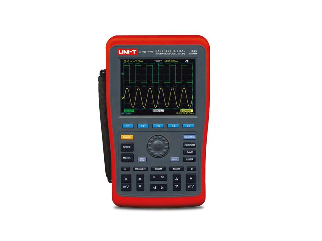 Přístroj UTD1102C kombinuje v jednom zařízení ruční dvoukanálový osciloskop a multimetr. Díky své přenosnosti, snadnému ovládání a pokročilým funkcím je ideální pro použití v terénu i v laboratoři. Osciloskop nabízí šířku pásma 100 MHz při vzorkovací frekvenci 500 MS/s a umožňuje automatické měření 27 parametrů signálu. Multimetr poskytuje přesné měření napětí, proudu, odporu a kapacity. Přístroj disponuje barevným LCD displejem s úhlopříčkou 5,7” a rozlišením 320 × 240 pixelů, který je čitelný i na silném světle.