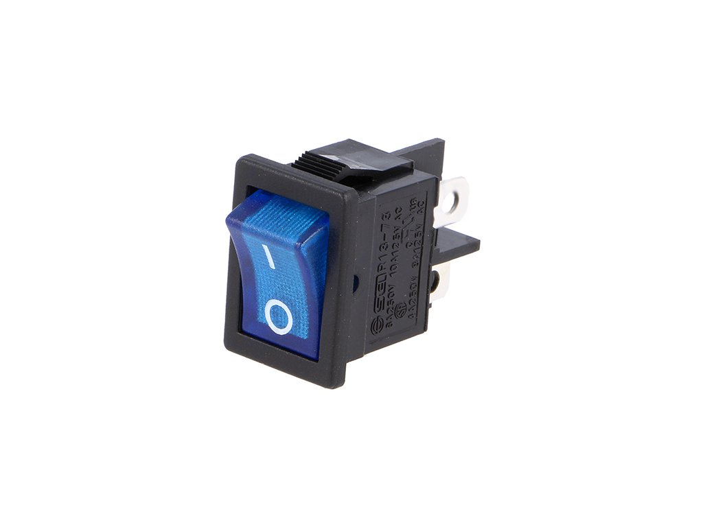 Přepínač kolébkový (ROCKER); DPST; 2 polohy; ON-OFF; 6A/250VAC; rozměry mont. otvoru 19,4x13mm; modrý; vývody 4x faston.