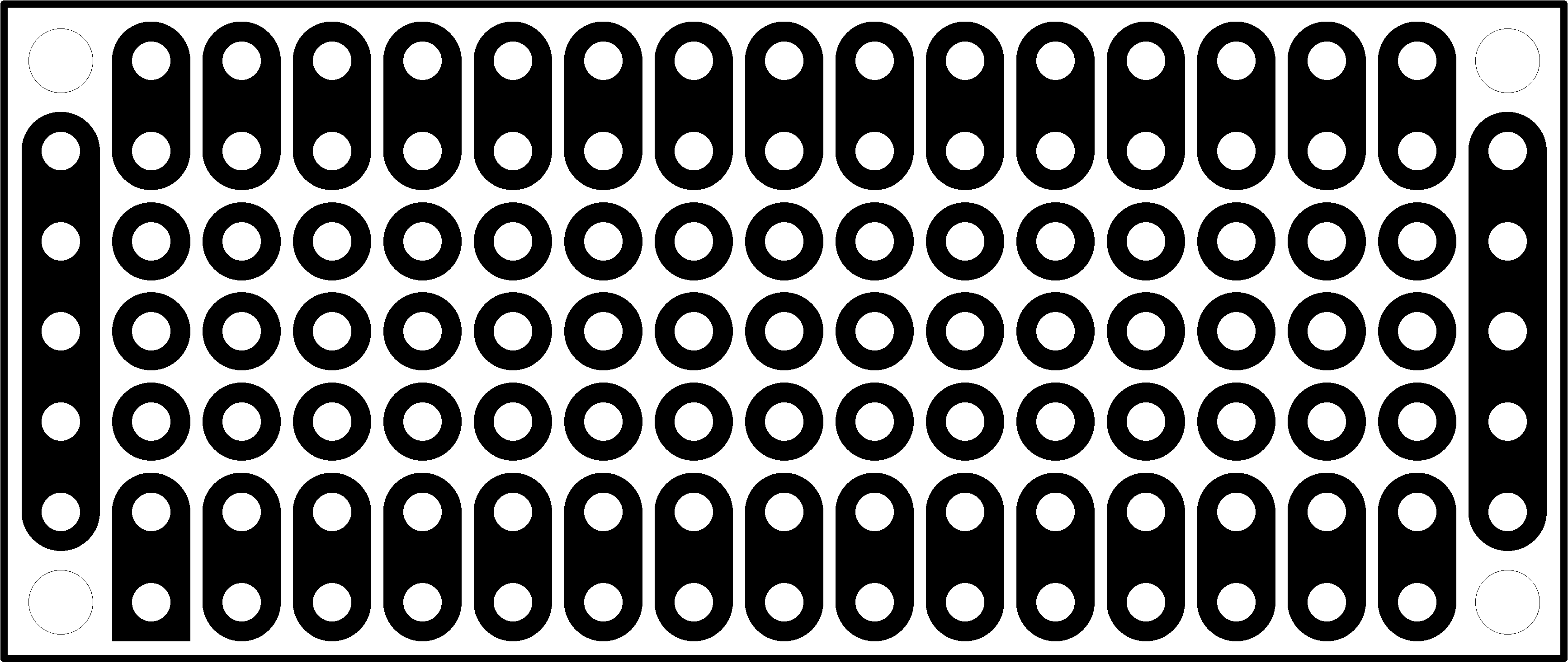 Univerzální plošný spoj, oboustranný, je navržen pro Arduino NANO. Tloušťka mědi je 35um a rozměr rastru činí 2,54mm. Průměr pinu je 1mm, přičemž jednotlivé nepropojené piny jsou umístěny po obvodu.
