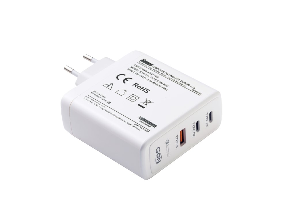 Spínaný zdroj s vysokým výkonem, ideální pro rychlé nabíjení různých zařízení. Tato nabíječka je vybavena třemi USB konektory (1x USB-A a 2x USB-C), což zajišťuje pohodlné a efektivní nabíjení.